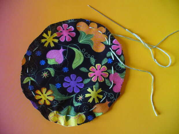 2. Utilice un hilo de aguja y bordado para hacer grandes hilván alrededor del borde del círculo de tela.