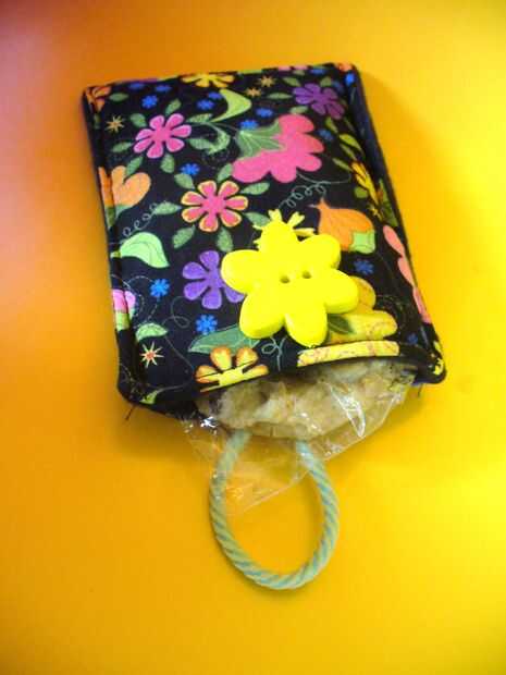 Un multiusos agradable tratar por un amigo de la oficina: una bolsa de tela para mantener una única cookie, conectado a una botella de bebida correspondiente.