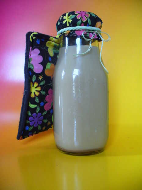 12. cubrir la tapa de la botella llenada y enfriada Mocha con la tapa de tela poco lindo. Ate el hilo de bordado en un arco.