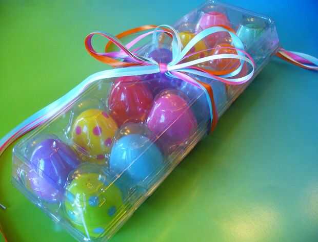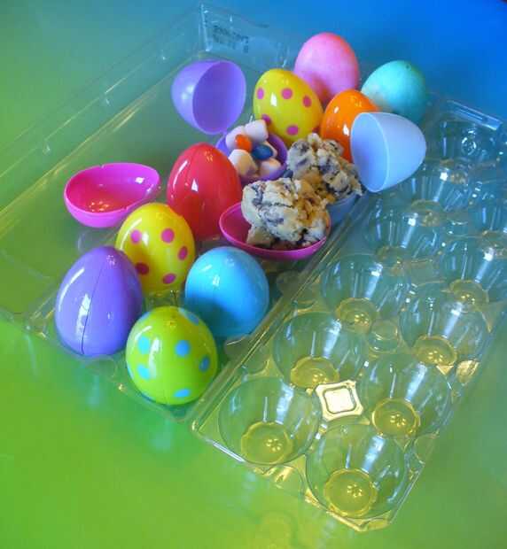 Limpie y seque un cartón de huevos de plástico vacíos y huevos de Pascua de plástico pequeñas de una docena. Abra y llene cada huevo de Pascua de plástico vacía con dos cucharadas de masa. También podría llenar algunos de los huevos con otros caramelos para mezclar en la masa de galletas antes de hornear, como M & M, besos de chocolate y otros sabores de chocolates como mantequilla de maní, chocolate blanco, menta. Incluyen instrucciones y una cinta de la hornada, y tu regalo está listo para ir!  Los niños les encanta la diversión de la adición de su elección de caramelos a la masa antes de hornear para personalizar sus cookies.