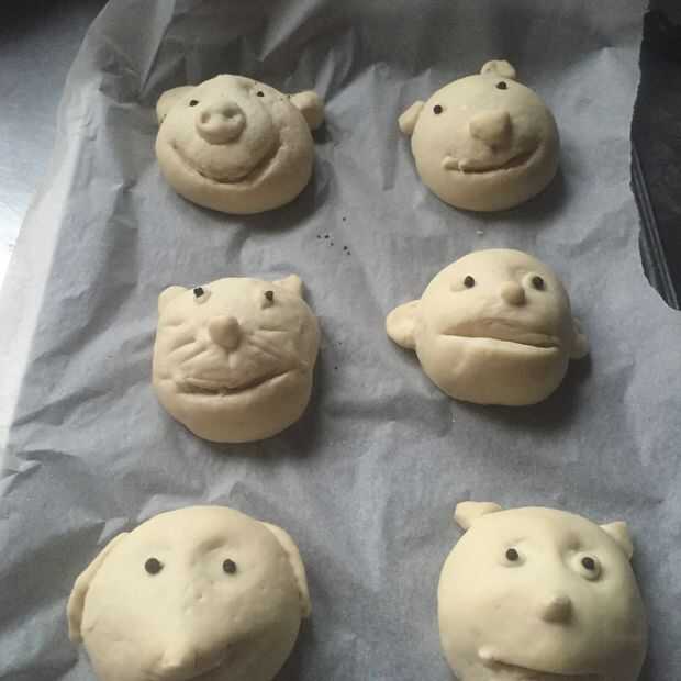 sacar pequeños trozos de masa de roll, hacer orejas nariz ojos pelo su elección ser creativo.