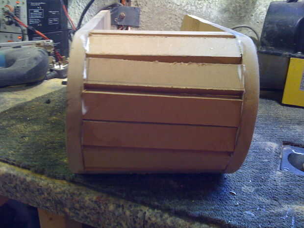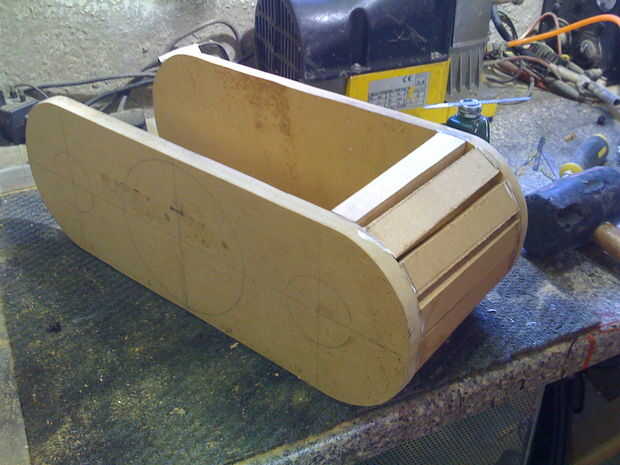 Ahora utiliza la fiel sierra circular para cortar cargas de 1 pulgada por tiras de 15cm de MDF y comenzó a pegar y uñas entre el delantero y el deflector trasero. Mantenerlos lo más cerca entre sí como sea posible es una buena idea. Me olvidé de decir que utilicé una sierra de calar para cortar los deflectores.