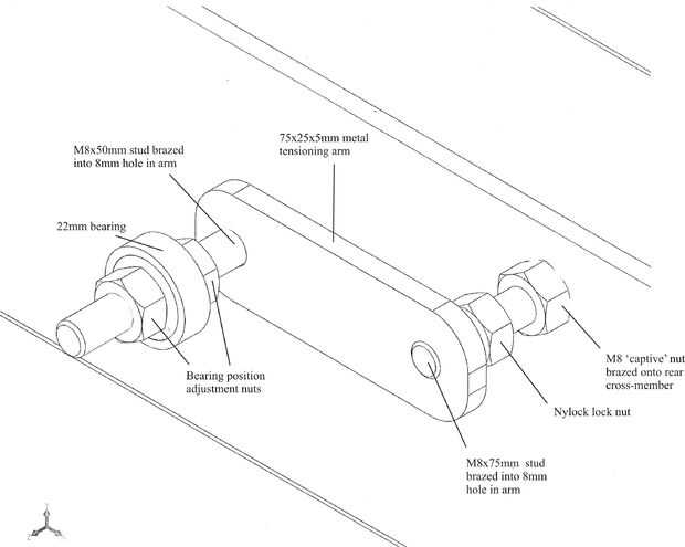 Primero ajuste las correas sobre la pullies instalado justo por encima del punto medio de cada marca un punto en la parte posterior de la correa miembro cruzan luego taladre un agujero de 8mm a través del miembro de la Cruz. Vea el bosquejo sobre cómo construir a un tensor de correa simple y encajar en su lugar en cada banda. Las dos piezas marcan 'K' en la de 5mm. Fichero DXF proporcionan los dos brazos del regulador. La longitud de 75mm para la varilla roscada en el carril de extremo es adecuada para el ancho de mi carril extremo. Esta longitud se debe ajustar para que la varilla puede colocarse a través de su elegido ancho de sección de caja de riel. Asegúrese que la tuerca cautiva soldada al carril extremo tiene una rosca limpia para permitir el ajuste de la varilla roscada.