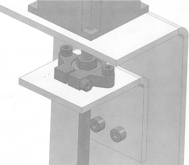 Usted debe han cortado ya los orificios de la grapa de placa de eje x (6) y la placa superior del eje z (18). Ajuste a una longitud de varilla de 8mm roscado al eje del motor mediante un conector propietario tener rosca la varilla a través de los orificios de la grapa y la placa superior. Medir la varilla a la longitud de la distancia entre el eje del motor y en la parte inferior de la placa superior en su máximo punto de viaje además de 60mm y corte a la longitud. Montar un 22 m m que lleva a la parte superior de la varilla roscada justo debajo de la Cala y fijar en posición utilizando y Tuerca M8 cada lado del rodamiento. temporalmente cabe una 22mm abrazadera en el soporte del cojinete y utilizarla para marcar los agujeros de montaje en la parte inferior de la tablilla, perforar, tap y fijar la abrazadera con dos tornillos de M6x10mm. Esto es tomar el peso del eje z en la Cala en vez del motor.