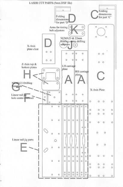 La pieza de trasmallo (parte F sobre el fichero 5mm.dxf) se muestra en la parte frontal de la mesa del taladro en la fotografía se utiliza para mantener constante los centros entre los soportes de la barra 150mm. Los dos orificios exteriores (5mm) tienen espigas de metal 5mm soldada o pegada en ellos. El orificio central tiene la parte superior de un taladro roto 4,2 mm fija en él. El trasmallo se incorpora en los dos juegos de agujeros abiertos en el lado izquierdo de las piezas de la canal a proporcionar 75mm y 150mm espaciado de sus soportes de carril linear.