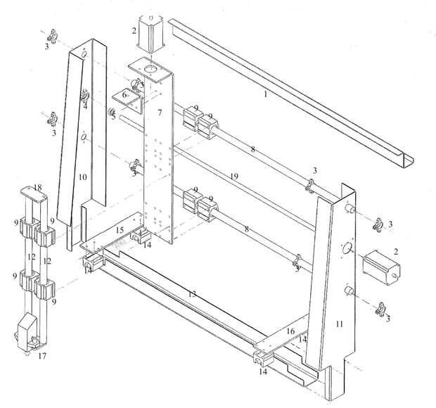 Ajuste el riel inferior (13) a la grúa para que los extremos encajen entre las alas de las patas del grupo pórtico (ver prestado pic). Taladro y un tornillo M5, toque a ambos lados de la articulación en cada extremo del riel. El riel inferior es la parte que es empujada y tirada por el eje y llevar tornillos y tiene que hacer frente a la inercia total del pórtico incluyendo cambios bruscos de dirección junto con las cargas impuestas de un material de corte del eje y así que usted considere necesarias para respaldar los pernos de soldadura o soldar las juntas entre el riel y las alas del panel después de montaje final para que sean tan fuertes como se puede hacer ellos.