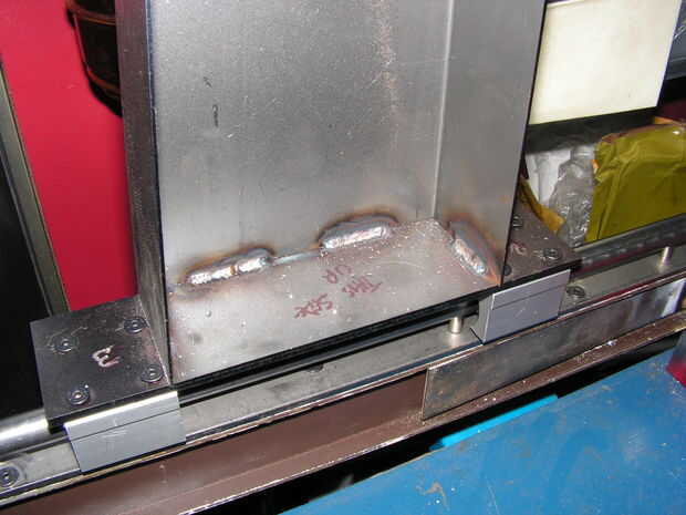 Continuación, las placas del carro deben ser fijado a la izquierda y la derecha pórtico paneles (10 y 11). Las placas del carro deberán estar equipadas a fin de que la muesca en el lado se localiza entre las alas y las patas en los paneles del pórtico y se vuelcan con el exterior de los paneles. Usted encontrará que las placas del carro hacen un ajuste ceñido en los paneles. Las placas deben soldarse a los paneles, pero debido a los diferentes espesores de los metales, usted tendrá que soldar solamente en pocas palabras funciona (ver foto) que se deformación las placas del carro. Encontré que la soldadura TIG es el mejor método cuando se aplica calor local muy rápidamente. Si todavía hay un ligero alabeo que afecta el funcionamiento de los rodamientos, puede ajustar con finas cuñas entre la placa y los cojinetes. Una vez que ambos portaobjetos de paneles fácilmente arriba y abajo el carril linear, estamos listos para la siguiente operación.