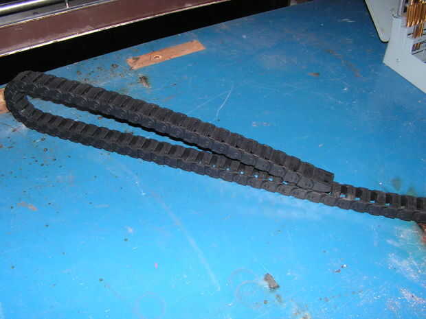 Es intencional que la baranda superior sobresale el grupo pórtico de mano derecha. Esto es porque el ferrocarril funciona como un canal para un conducto de 'cadena' de cable (ver foto) para las conexiones del eje z que serán dirigida por el grupo pórtico de mano derecha. La longitud adicional puede utilizarse entonces para los conectores para el cableado que realzará grandemente mantenimiento. El uso de un conducto de 'cadena' de cable cuando se llega a instalar la electrónica es esencial, ya que se propaga el combado del cableado eléctrico en su propia longitud y evita puntos de tensión en el cable que podría causar fallas que serán muy difícil rastrear. Además de eso, la vista de la cadena plegado sobre sí mismo en uso parece 'genial', al igual que una máquina comercialmente hecha. Deliberadamente no he incluido ningún otro detalle para el cableado como su opción de la electrónica y conectores será una cuestión de la elección individual de los componentes.