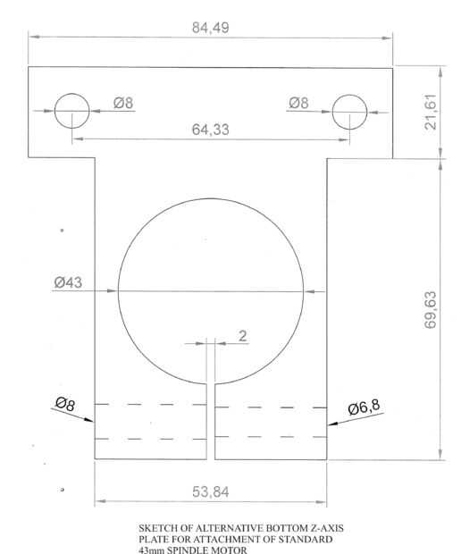 La parte inferior de la placa del eje z (17) está diseñada para acomodar un pequeño router que utilizaré para trabajo fino. Es también una configuración útil para montar una antorcha de plasma con medida abrazaderas si desea hacerlo. Esta placa también se fija en los extremos de las barras de 20mm (12) utilizando tornillos de M8 en los extremos perforados. He incluido un archivo DXF que puede ser utilizado para hacer una placa de reemplazo inferior de aluminio 20mm para dar cabida a un eje de cuello 43mm estándar motor para el corte más pesado.
