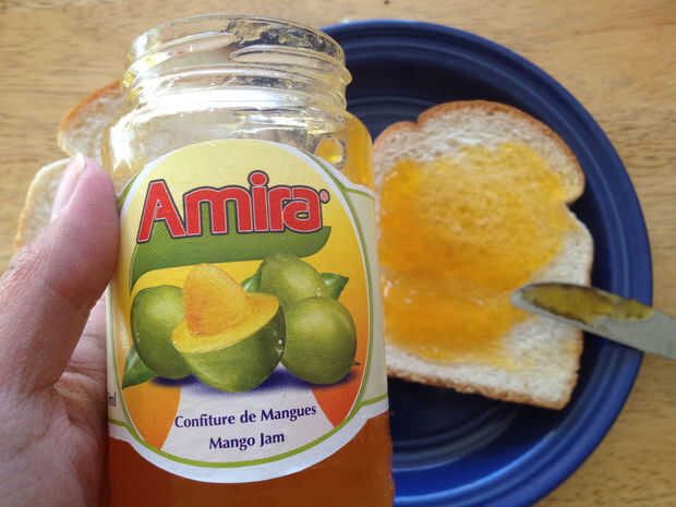 Extender la mermelada de mango en dos rebanadas de pan, apilarlos y con un cuchillo o cortador redondo, cortar una ronda, sacando la corteza marrón.