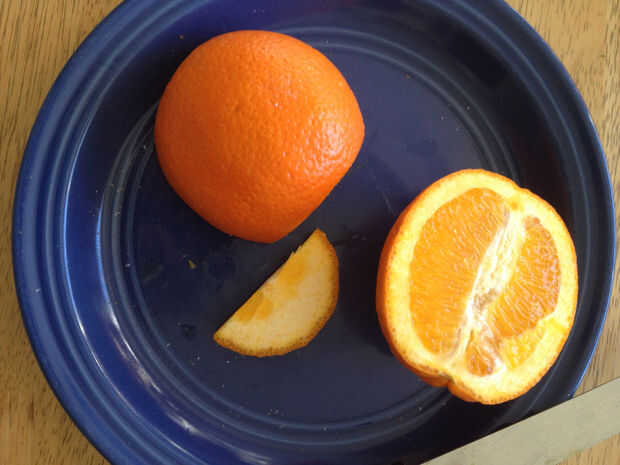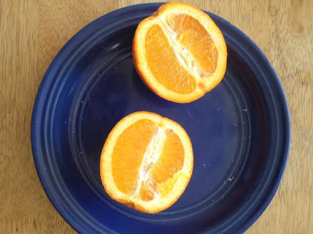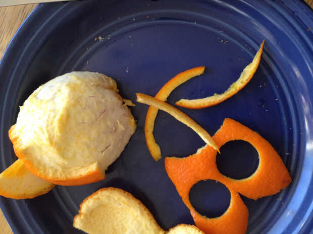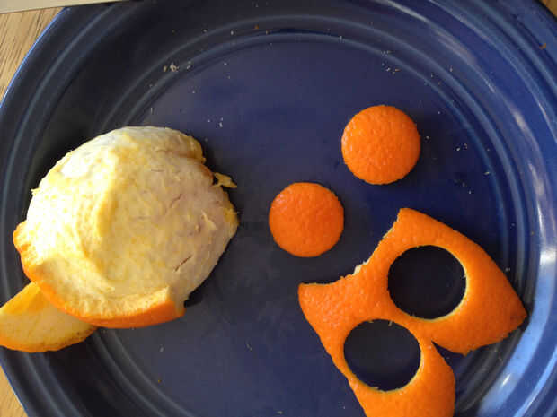 Para el vestido (zona de la falda y el hombro), reducir a la mitad una naranja. En una de las rebanadas, corte la parte superior un poco, como se muestra en la imagen. Luego de la otra rebanada, pela la piel y corta círculos para las hombreras del vestido de la princesa. De la misma piel, cortar dos tiras largas.