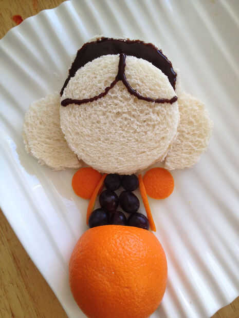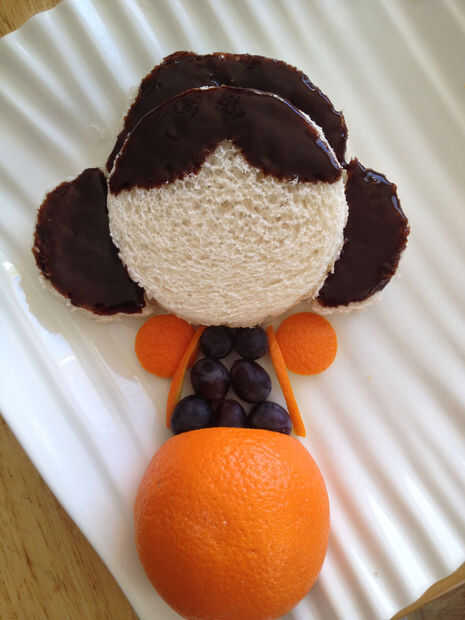 Comenzar colocando el bollo de la cabeza y el pelo en servir. Colocar la naranja y la cáscara junto con uvas como el vestido como se muestra en la imagen