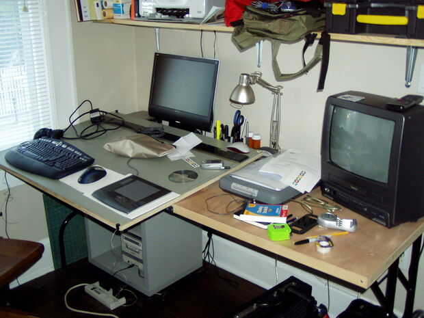 La razón por la que diseñé lo que hice es que podría tener un área de redacción frente a la pantalla del ordenador y todavía tiene espacio en el lado derecho de mi pintura, lápices, X-acto, cualquiera que sea.