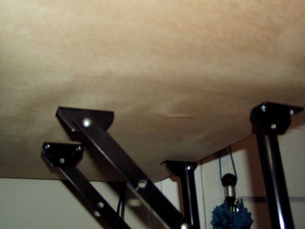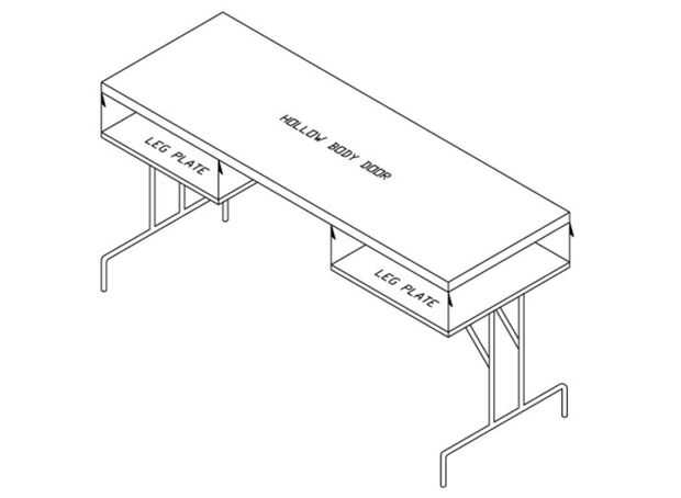 Como se puede ver en la imagen, no utilizo una placa de madera contrachapada de la pierna. Es una buena idea usar uno, porque la piel de la puerta es muy delgada y no mantiene bien los tornillos. Mi mesa era de chatarra, así que no tengo suficiente madera :(