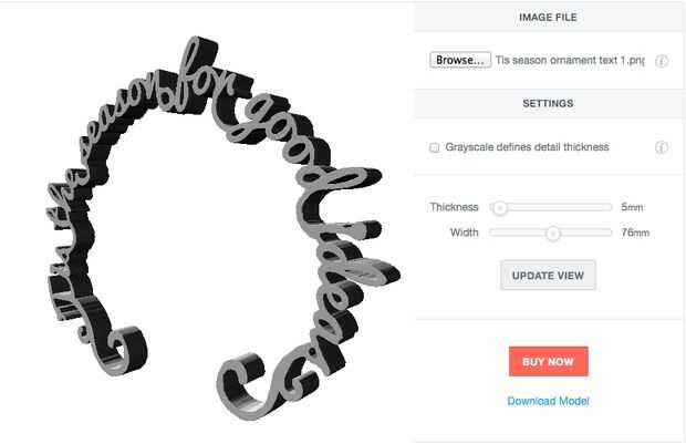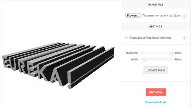 Luego, realizar dos imágenes: uno del texto "Eureka!" y el otro de la "'Tis la estación" texto. Utilice https://www.shapeways.com/creator/2dto3d para tomar el texto blanco y negro y para sacar en formas 3D. Es mejor crear una extrusión fina de "'Tis la estación," y una muy gruesa protuberancia de "Eureka", como se muestra. Prensa "descargar modelo" y usted obtendrá dos archivos .x3db.