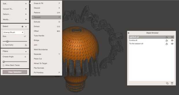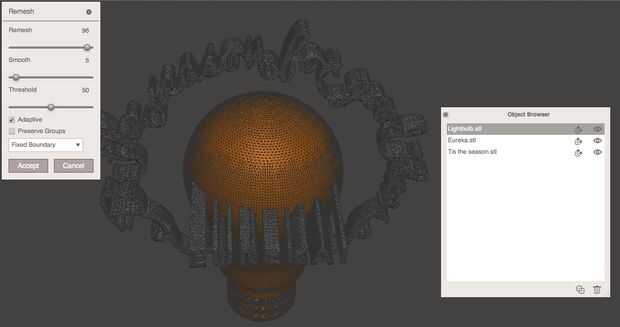 Con Meshmixer (http://www.123dapp.com/meshmixer), importe el texto ornamento DST y la bombilla STL. Utilice el examinador de objetos para cambiar entre los archivos. Puede que deba cambiar el tamaño o rotar (editar → transformación) uno u otro para obtener la proporción correcta.