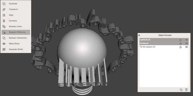 Entonces, usando el teclado, seleccione bombilla shell primero y el Eureka! Shell en segundo lugar en el explorador de objetos. Aparecerá un cuadro de diálogo; Seleccione diferencia booleana. Esto cortará un conjunto en forma de texto de los agujeros de la bombilla.
