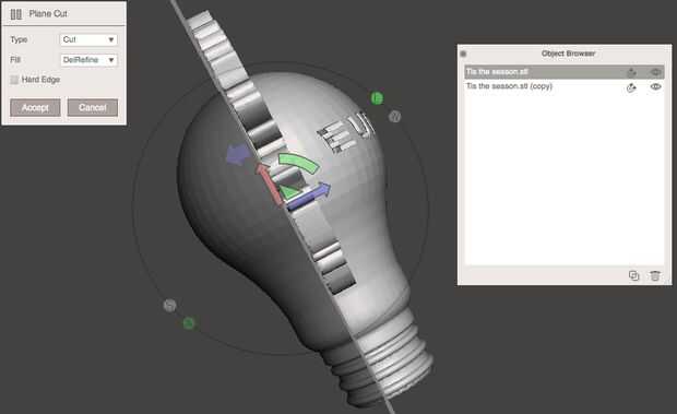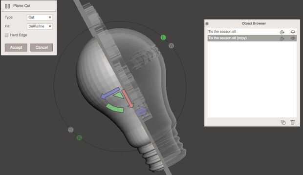 Todavía en Meshmixer, duplicar el modelo. Selección de la primera copia, elija Editar → cortar de plano → corte. Ajuste del plano de corte para que quede justo detrás (pero paralela a) el texto y aceptar de golpe. A continuación, seleccione la segunda copia y también establecer el plano de corte a derecha detrás del texto. Sin embargo, antes de cortar, utilizando la flecha gire, darle la vuelta 180 grados a la original (uso de marcas de la señal para obtener una medición exacta). Luego presione Aceptar.