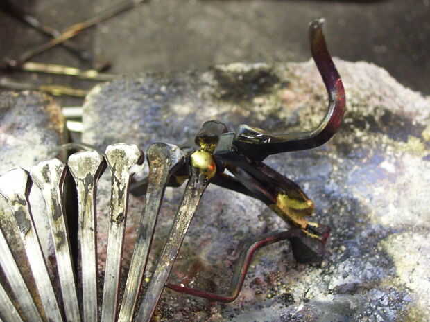 La idea es poner la cabeza en un ángulo, por lo que está mirando para el lado. Lo que normalmente hago es que alguien sostenga la cabeza con unas pinzas y soldar rápidamente la cabeza en la parte superior. \