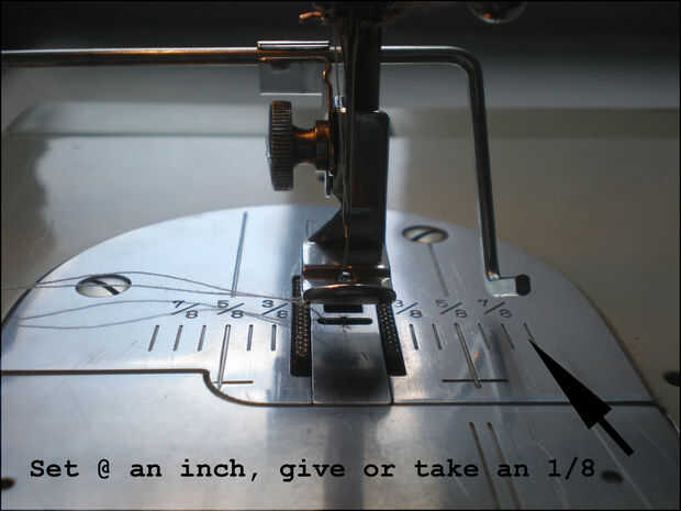 Ajuste la guía de acolchado en 1 pulgada (ish). Esto le dará una agradable reunión completa a lo ancho de la bufanda.