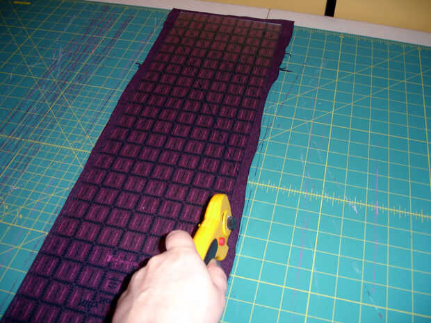 Usar una estera con un cortador rodante y una regla pero no tienes que--solo corte dos tiras que tienen la misma longitud. Si desea a un Franken-bufanda multicolor, puede coser las tiras pequeñas de camisetas de colores diferentes para hacer dos tiras largas que tienen aproximadamente la misma longitud.