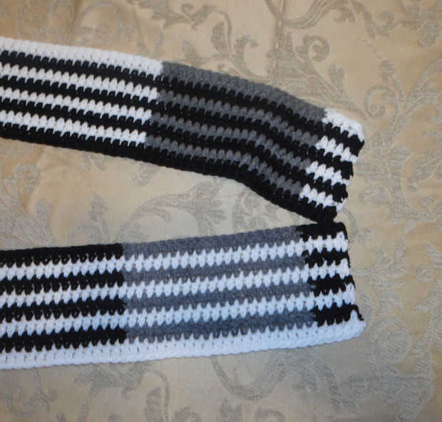Fila 2: dc en el ch 4 de gancho, CC 8, cambiar el color a C: dc 15, cambiar a color B: dc para terminar, cambiar a color A: ch 3, la vuelta.