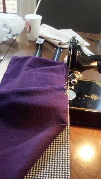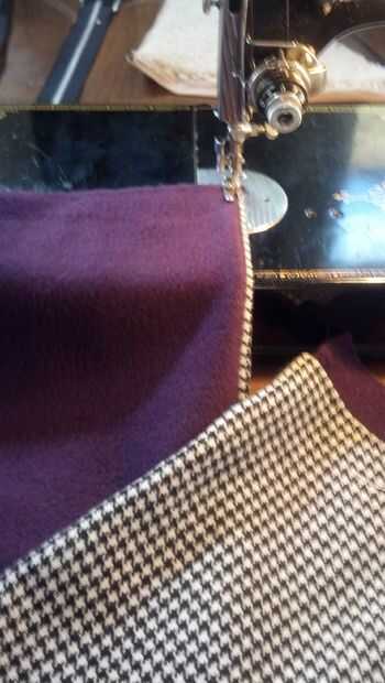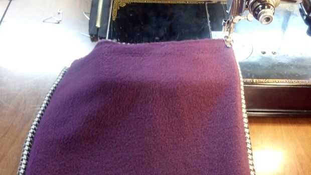 Los dos materiales se cosen juntos para que cuando se colocan acostadas el material exterior vuelca aproximadamente 1/4" a y la parte inferior. Entonces se volvió el "funda" derecho-lado-hacia fuera y cosida a la costura o "cosida en la zanja."