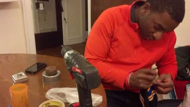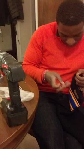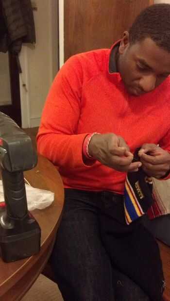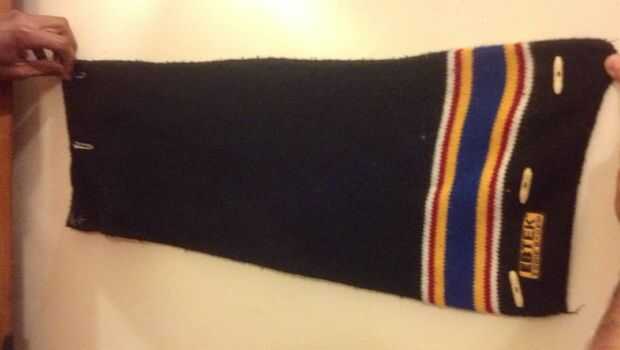 El primer prototipo fue una bufanda común, que cortamos por la mitad. Hemos añadido los ojales y botones de madera que hicimos de un taco.