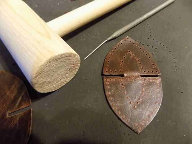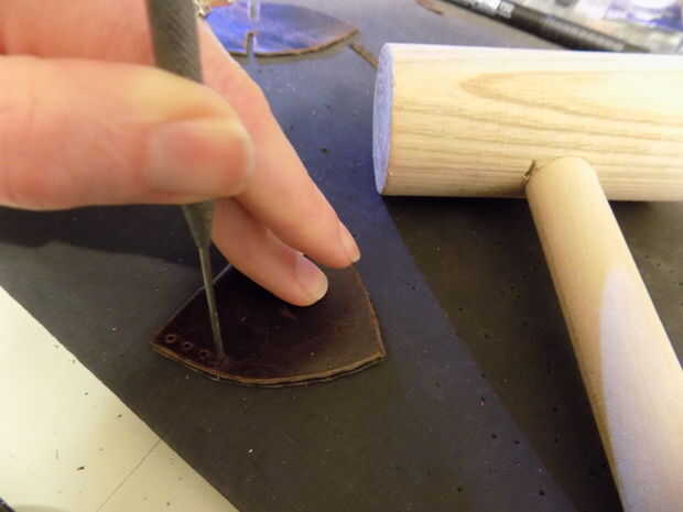 Doblar cada pieza de cuero por la mitad y usar una aguja y martillo martillo orificios costuras alrededor del borde.