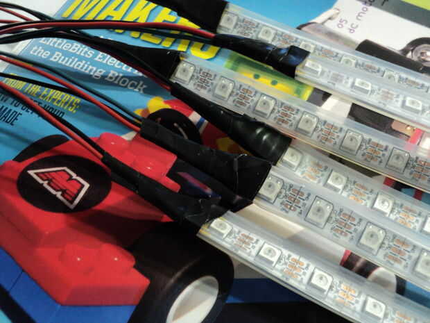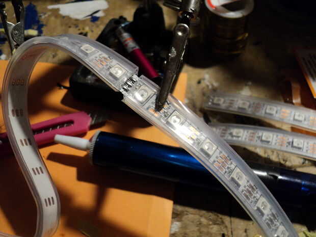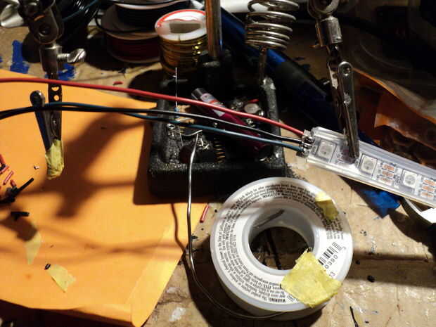 Asado de los extremos de dos tiras que hice. Demasiado calor y soldadura derretirá apagado la tira de plástico o doblar los alambres soldados se retire las almohadillas de soldadura frágil. En lugar de pegamento caliente usé algunos kapton cinta para sellar los extremos y luego envueltos con cinta aislante para alivio de tensión adicional. Uso de alambre trenzado, aún mejor, la silicona carcasa cable que es muy flexible.