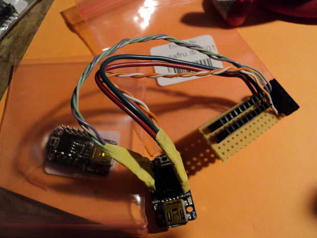 Cuando prototipos, es útil para hacer cosas modular o enchufe. Construí un pequeño breakout Junta para conectar a la baratija. Sabía que tenía que poder mi 5 Neopixel tiras (pines 5 máximo control en el Abalorio) para tener un enchufe en tablero con carriles de alimentación común como un protoboard hacer las cosas mejor (tal vez electrónica TOC algo, realmente bueno para la solución de problemas). Tengo un montón todo grande de cabeceras y clavijas así que hice el tablero de arranque con un pequeño trozo de perfboard. Después de leer todos los tutoriales de nuevo, debo haber también poner un condensador en las líneas de energía y algunas resistencias en los cables de señales para evitar posibles daños en las tiras de Neopixel caras. Hacer eso.