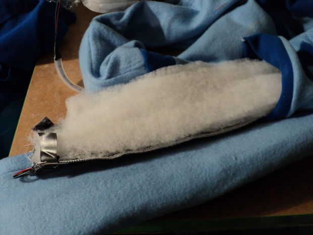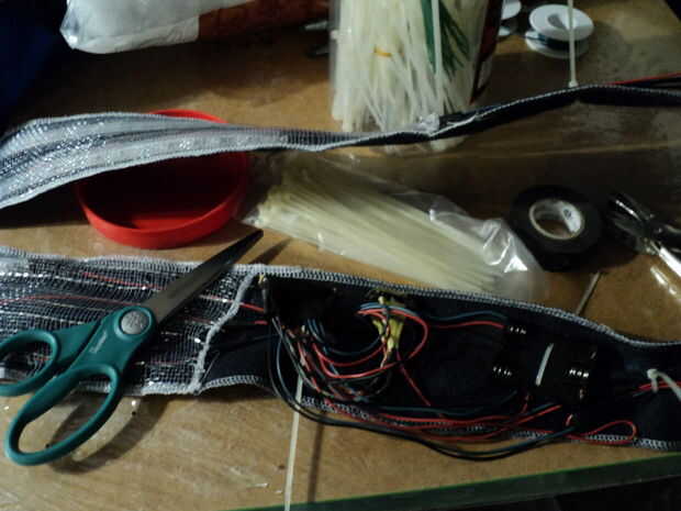 Coloque una o dos capas de sobre la malla de bateo Neopixel Asamblea para difundir los LED discretos. Probablemente podría hacer otra máscara para el más fino detalle en las luces usando un diseño de plantilla de circuito que era toner impreso en un gel de transparencia. Sería muy bueno para solo impresión de textil el diseño en la capa externa de la tela.