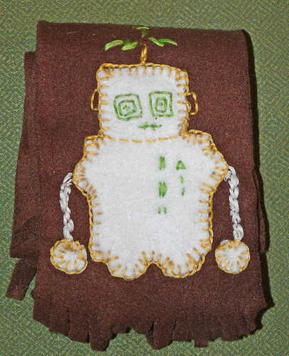 cuando el clima se volvió frío después de Navidad, mi niño de 2 años de edad vio mi bufanda y quería una bufanda de los suyos. El niño ama a robots (que no!) y tuve una visión de un pequeño robot lindo decorar su nueva bufanda. Tenía algunos restos lana marrón y un trozo de lana blanco fieltro y algún hilo de bordar, así que pensé, por qué no prototipo hacia fuera y ver lo que pude llegar a!