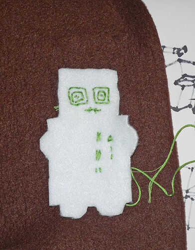 Luego, coser en la cara de robot y botones en el cuerpo con hilo de bordar, generalmente siguiente el patrón. (No coser el blanco a la brown todavía)