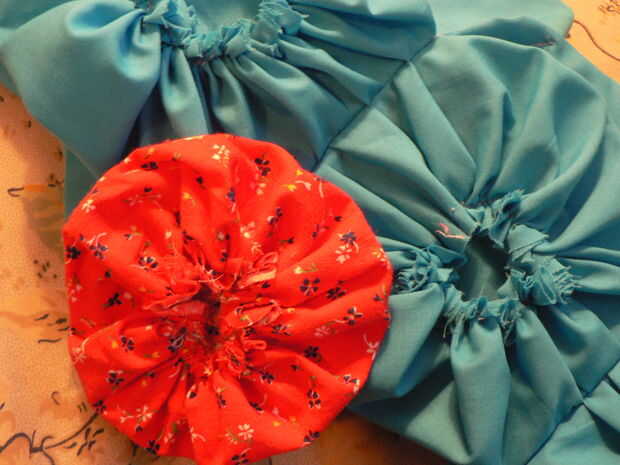 2. hacer tus yo-yos más pequeño para una bufanda delgada, es decir, comenzar con un círculo de tela 6'' diámetro y conseguir lindo poco 3'' yoyos de diámetro.