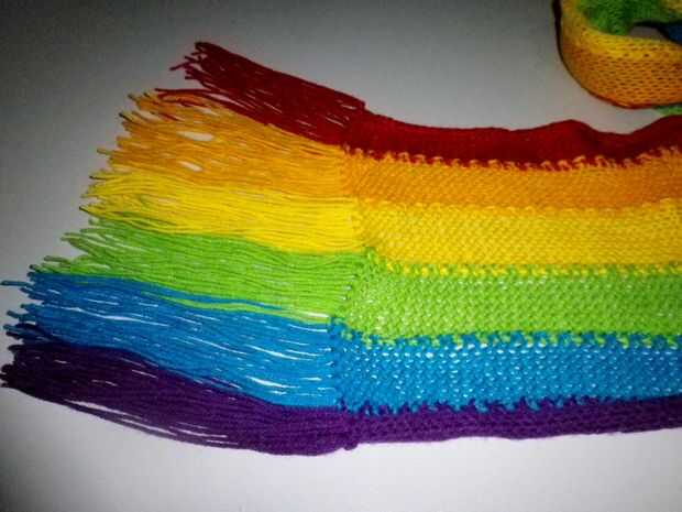 Las borlas que agregué al final son 20cm de largo. Agregué 2 sets de borlas para cada punto de cada color, y donde los colores cambiaron lo hice uno de cada uno.