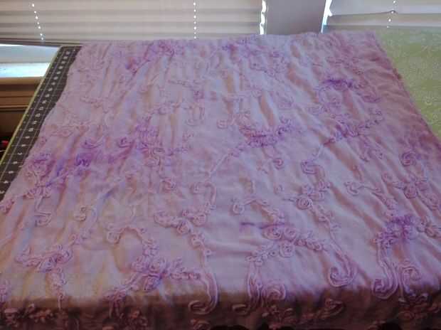 Lo que más me me ha pasado el otro día! Un amigo apareció con un montón de restos para mí! En la pila, fueron un par de yardas del este precioso lazo-murió lavanda. Me encanta bufandas de infinito, así que decidí utilizar un poco de esta tela para hacer uno. He utilizado uno ya tenía como un patrón. Empecé con un rectángulo que estaba cerca de 70 x 35 pulgadas. (Esta tela era muy escarpada, usé un rectángulo bastante grande para dar mi bufanda algún bulto. Si se utiliza un material más grueso, como un jersey, puede el rectángulo sea un poco más estrecha.)