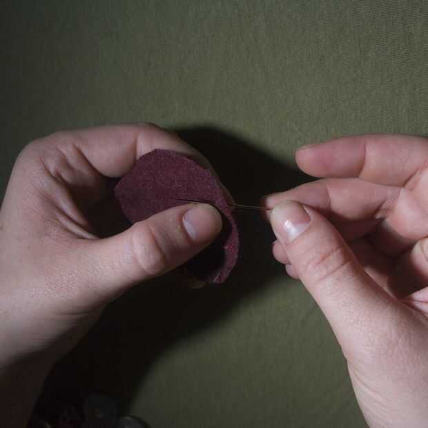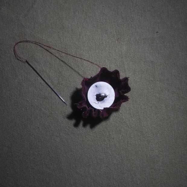 3. después de tejer una vez alrededor del círculo, insertar el botón y pase el hilo alrededor de la base del botón. Seguir coser alrededor del círculo una vez o dos veces para asegurar antes de atar el hilo. Asegúrese de que la tela sobre la superficie del botón se enseña. Repita hasta que todos los botones están cubiertos.