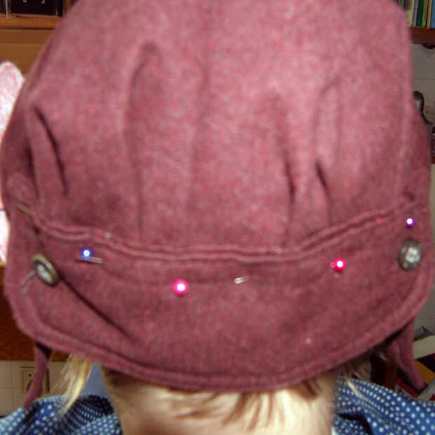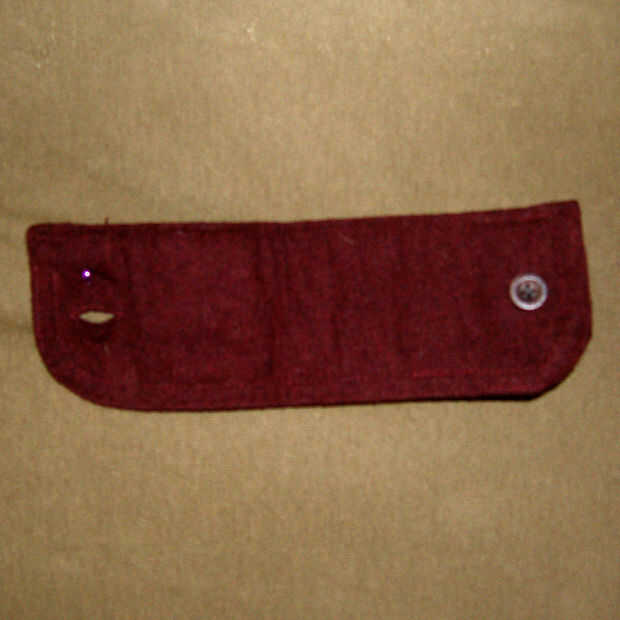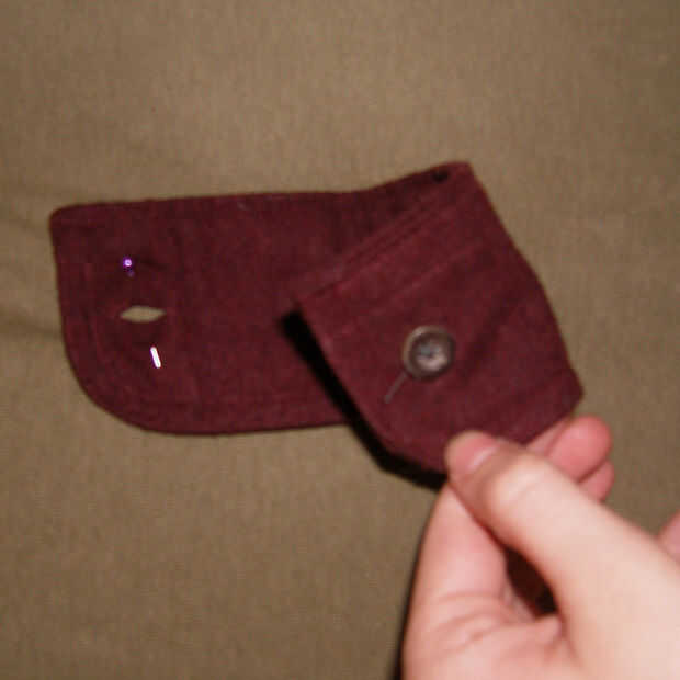 3. después de que el brazalete sea del tamaño que necesita mover coser el botón y robar un botón desde la otra banda. Figura hacia fuera donde quieres los botones y cose uno en el mismo lugar en cada lado. Esto hará que se vea agradable cuando se unen en el collar / "bill" del sombrero.