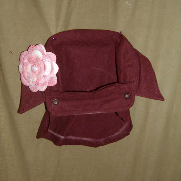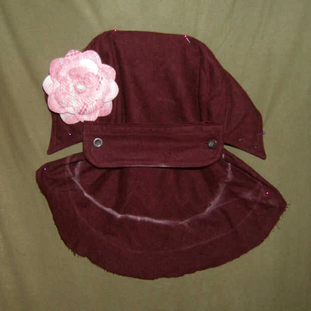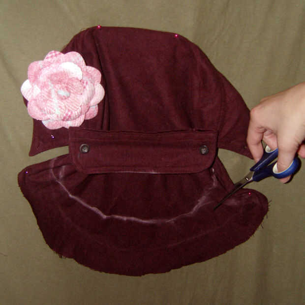 4. Instale el manguito ("correa de espalda hat") en el collar ("bill) y jugar con los pliegues en la tela mientras está en su cabeza. El tejido será demasiado largo, así que dibujar otra línea en la parte inferior de la banda pasa a través de la tela. Volver a sacar el manguito y luego cortar a la tela a lo largo de la línea. doblar el material debajo para hacer un borde limpio, pin y coser (esto es sólo para hacer la tela más fácil de manejar, es no que coser el manguito todavía).