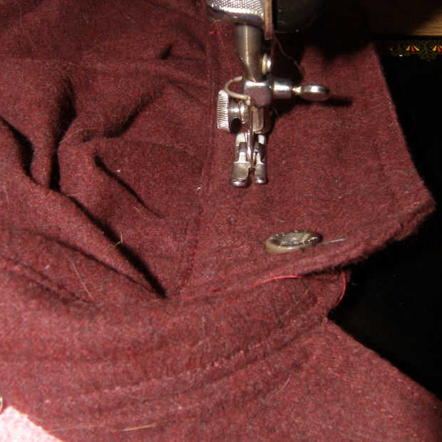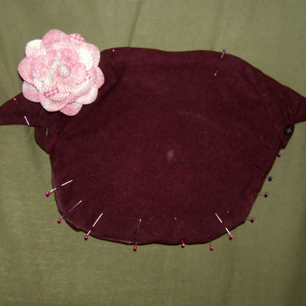 5 una vez que haya terminado el borde, vuelva a colocar el brazalete y prender a la tela debajo de él. Hice varios pequeños dobleces para un efecto de dominó (se puede ver en la foto donde estoy usando el sombrero más abajo), pero también se podrían hacer uno o dos grandes pliegues para una mirada más dramática.