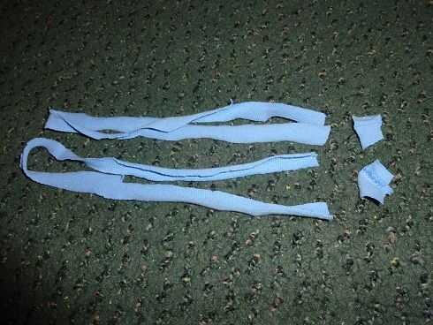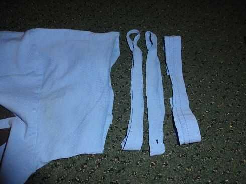 Agarrar una de las camisas y se centran en las mangas. Sacar el dobladillo de la manga y corte tiras de 2 o 3. Donde el manga es cosida, corte ese trozo.