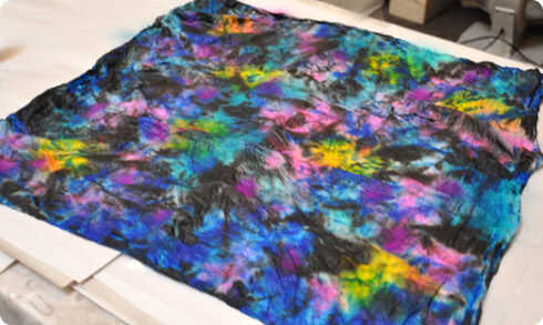 Para el resto de la pulverización dejamos la bufanda un poco aplastada por lo que el desnivel contribuiría a la textura. Depende de usted si usted quiere aplanar más. Ya que hemos añadido tanto color oscuro, agarrar la #5 amarilla a continuación, obtener el fluir de la pintura y luego añadir en algunos reflejos amarillo brillantes. Trabajar en algunos de los 33 #, #34, #59 y #61. No tenga miedo de superponer colores un poco. Puede utilizar el agua para volver y ayudar a áreas de mezcla si desea ser más suave.