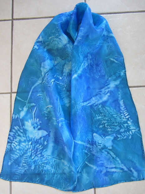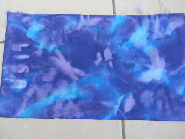 Retire sus objetos y llevar dentro.  Cuidadosamente retire los pañuelos de papel de congelador y quite cualquier grapas a mano para no arruinar a la tela.  La tela otra vez para establecer el color del hierro.  Si es necesario, enjuague la tela para eliminar algunas de la rigidez, secar y planchar otra vez. Hice estos proyectos el 1 de noviembre con temperaturas en los años 50.  Tomaron más tiempo en secarse y me impacientarse con él y quitado algunas de las hojas antes de que estuviera completamente seco.  Tenga en cuenta que las arrugas se imprimirán también.  Creo que salió bien.  Usted conseguirá un agradable mezcla de colores, así que incluso si usted piensa que no le gusta su combinación de color cuando ha mojado, usted puede ser sorprendido agradablemente. Tengo pensado en hacer una bolsa de sándwich de la tela.  Yo he estado vendiendo pañuelos y otros artículos impresos en el mercado de un granjero local de sol. Mi web es www.wildcreekgardens.com.