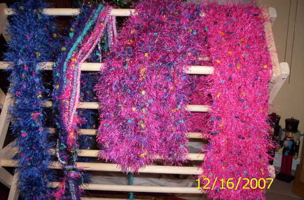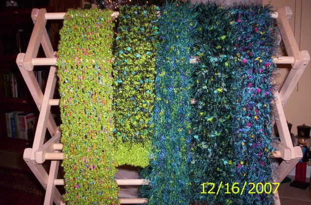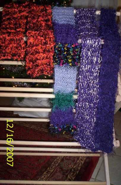 He utilizado un patrón de bufanda fácil de 14 puntadas en suturas de tamaño 15 o 10 en 35 agujas tamaño. I Liga cosido completamente utilizando dos tipos de hilo - cualquier marca del León de piel de la diversión o lujo piel y boucle de la marca del León, o un hilo de cinta o León marca Romance o lo que sea... usted consigue el cuadro.