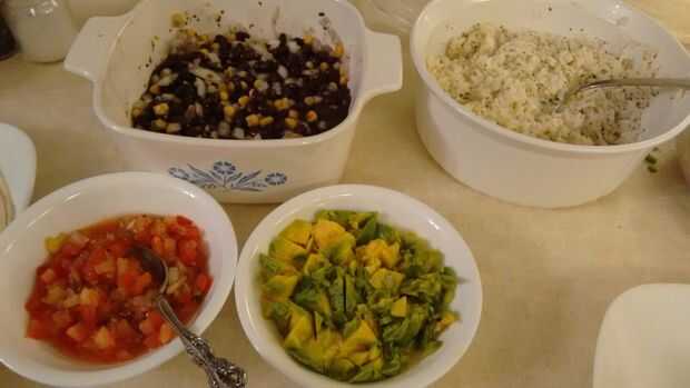 Organizar su cilantro arroz, carne molida, salsa de frijol y maíz negro y estilo buffet variados condimentos (guacamole, crema agria, salsa de tomate, queso).