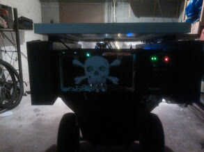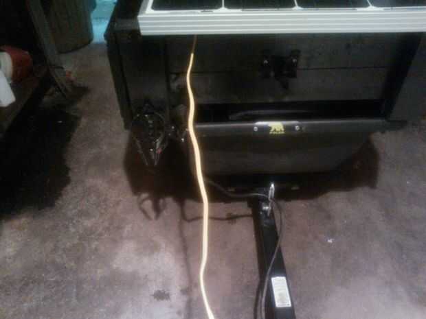 El trailer es un acoplado de la yarda con un límite de peso de 500 lb. Usar un remolque de bicicleta en un punto, pero no están construidas para mantener la cantidad de peso que estaba buscando. Tiene una caja de madera unida a la parte superior, que un panel solar de 100 vatios se abisagra demasiado. El regulador solar está situado en la parte trasera de la moto. . en el futuro el plan es tener un acoplado construido con material más ligero con un perfil más bajo.