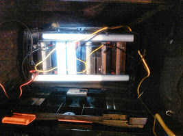 En el trailer es 4 12 v 20 ah baterías a ser un 48 voltios 20 ah batería. Esto se utiliza para alimentar la rueda de la bici hay también 2 12 voltios 20 ah baterías conectados a 1 12 v 40 ah batería que se carga a través del panel solar. Conectado a la batería es una inversión de 750 vatios er utilizado para cargar el celular de 48 voltios así como generar energía para las luces, recarga celular, pilas o lo que aparato eléctrico lo necesario para camp... Estas son las baterías del barco y son pesadas. Estoy trabajando para actualizar el tipo más ligero del litio células pero otra vez el costo no es en el presupuesto en este momento.