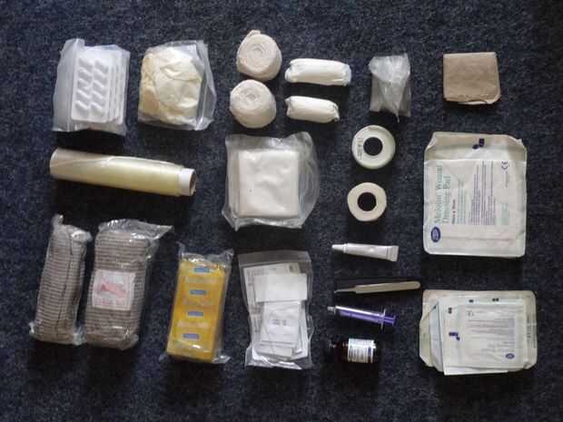 Botiquín grande está dentro de dos doblado bolsas ziplock, luego el bolso impermeable. Cubre escenarios básicos como muchos como sea posible. Habiendo pasado por él, yo voy añadiendo que en los próximos meses. (También tengo un pequeño personal de primeros auxilios)
