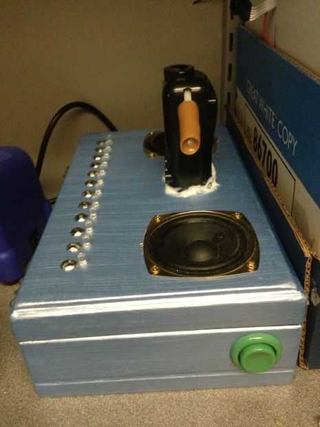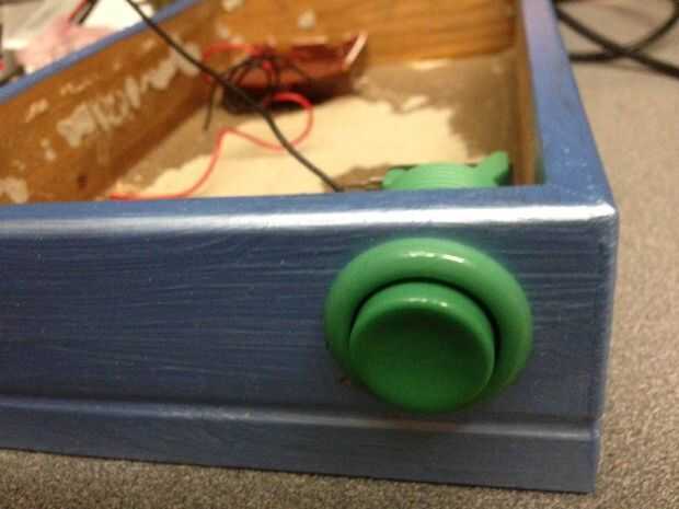 Tuve algunos botones de estilo arcade y les instalé uno a cada lado de la caja, estilo pinball. Instalación de la primera de ellas fue una lucha, perforé el agujero con una broca de 1" de bits, y resulta que el botón era 1 1/8". Tuve dificultades para raspar el agujero hasta que encontré un viejo cuchillo de filete que tenía puesta alrededor para abrir cajas. Que cortada a la derecha hacia fuera y en. He añadido un negro uno en el otro lado. Verde se convertiría en un palanca que permite seleccionar voces y los sobres de las teclas de la 12 tapa. El negro es un conmutador que permite seleccionar la escala que están asignados a. (6 sobres, 6 voces, 12 escalas) Sostener ambos botones a la vez le permite modificar la escala que está seleccionada activando LEDs de encendido y apagado.
